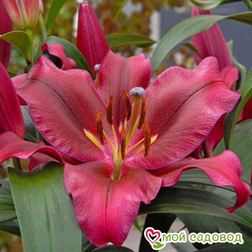 Лилия восточная «Авиньер» — цветущий луковичный многолетник-гибрид. Вырастает до 100-120 см, формирует душистые, очень крупные цветы — до 25 см в диаметре. Окраска темно-бордовая, в середине цветка — более светлая. Лепестки глянцевые. Хорошо смотрится в групповых и одиночных посадках, идеально выглядит в букетах. Время цветения — с июля по сентябрь. Посадка лилии: Глубина посадки лилии зависит от почвы. Если почва легкая – можно углубить на 12-13 см, что составляет 3-4 диаметра луковицы. Если же почва глинистая или тяжелая, достаточно двух диаметров, глубина лунки не более 5 см. В выкопанную ямку насыпьте слой песка, установите луковицу донышком на песок, присыпьте сверху остатками грунта, сверху замульчируйте. Уход за лилией: Пышных бутонов у лилий можно добиться, соблюдая обычные правила ухода: в первый год лилиям не нужна весенняя подкормка, удобрения вносятся разово за сезон, после цветения. Но это лишь в том случае, если перед посадкой вносилось удобрение. Перед началом цветения высокорослые сорта рекомендуется подвязать. После цветения засохшие бутоны удаляют. Полив умеренный: лучше не долить, чем перелить. Если цветок начал чахнуть и имеются подозрения на перелив – смешайте по столовой ложке речного песка и древесной золы, высыпьте под цветок и не поливайте ближайшую неделю. Полив лилии важно проводить под корень, старайтесь исключить попадание воды на листья, это провоцирует ожоги на солнце и распространение грибковых заболеваний.